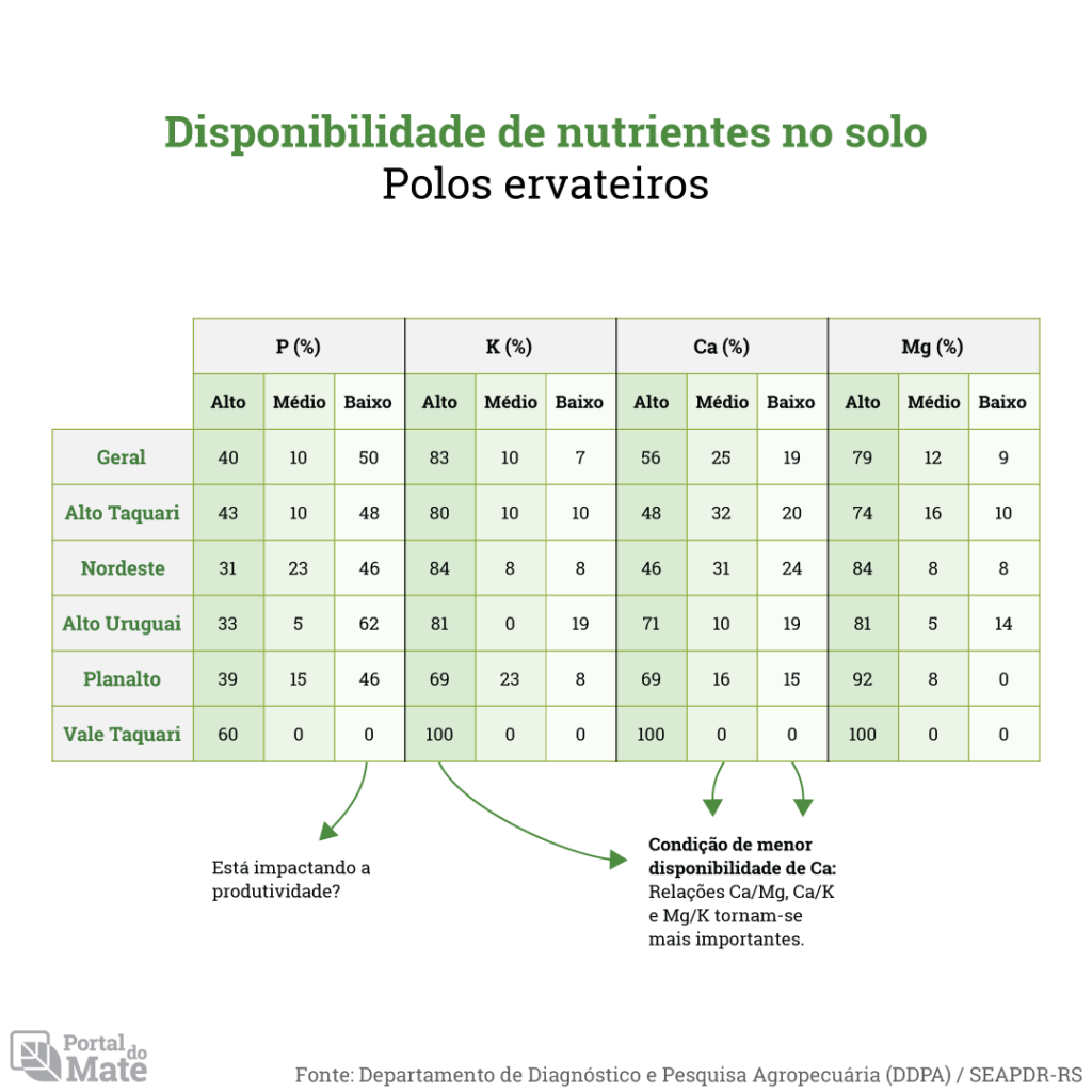 Quanto à disponibilidade de macronutrientes no solo, o fósforo (P) foi considerado baixo em 50% dos ervais, enquanto o potássio (K) foi considerado alto em 83% das amostras. Já o magnésio (Mg) é alto em 79% das propriedades analisadas e o cálcio (Ca) varia entre alto (56%) e médio (25%).